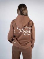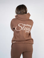 Creado para quienes enfrentan cada día con determinación. Confeccionado en algodón pima de alto gramaje, de color cafe este hoodie ofrece abrigo, durabilidad y una suavidad superior. Su diseño robusto y cómodo lo convierte en una prenda ideal para cualquier ocasión: desde tus entrenamientos hasta tu rutina diaria. Luce en la espalda el mensaje “NOTHING STOPS YOU” (Nada te detiene), de color vainilla, una declaración de fuerza y carácter. Este estampado no solo completa el diseño con actitud, sino que simboliza que eres un guerrero: firme, resiliente y listo para seguir adelante sin importar las circunstancias.