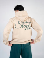 Creado para quienes enfrentan cada día con determinación. Confeccionado en algodón pima de alto gramaje, de vainilla, este hoodie ofrece abrigo, durabilidad y una suavidad superior. Su diseño robusto y cómodo lo convierte en una prenda ideal para cualquier ocasión: desde tus entrenamientos hasta tu rutina diaria. Luce en la espalda el mensaje “NOTHING STOPS YOU” (Nada te detiene), verde botella ,una declaración de fuerza y carácter. Este estampado no solo completa el diseño con actitud, sino que simboliza que eres un guerrero: firme, resiliente y listo para seguir adelante sin importar las circunstancias.